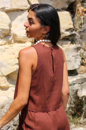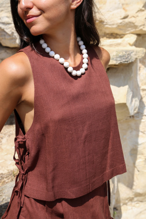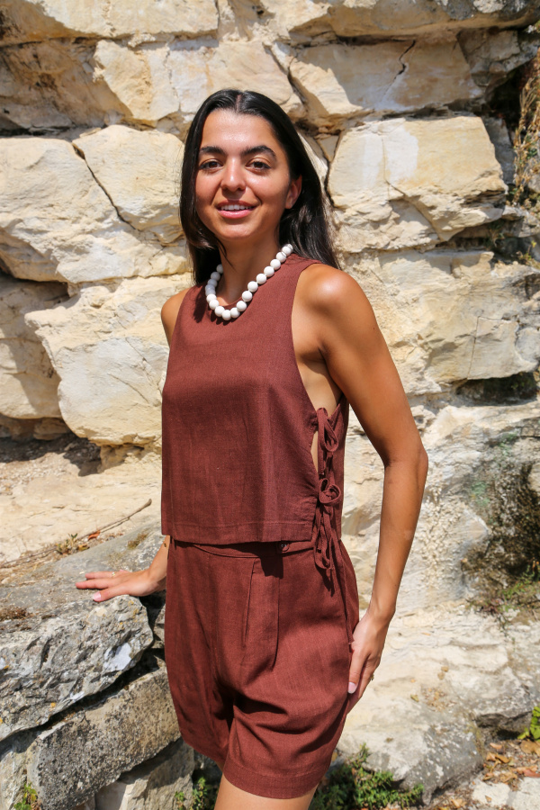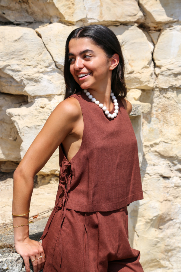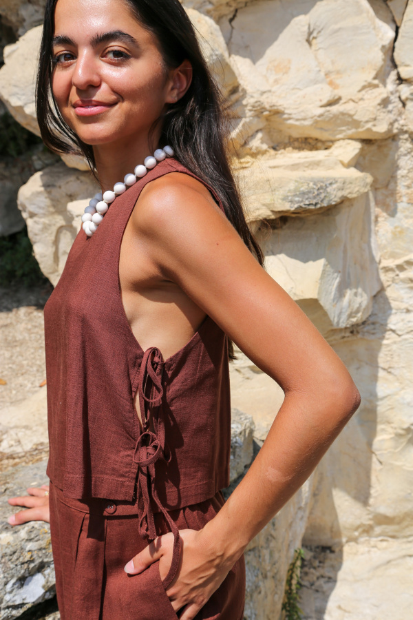 Ce top sans manches allie minimalisme et originalité avec ses côtés ouverts, subtilement noués pour un effet léger et aérien. Son col rond classique apporte une touche de douceur, tandis que la coupe droite assure un tombé fluide et flatteur. Parfait pour les journées ensoleillées ou pour superposer avec style, ce modèle revisite le basique avec une touche moderne et féminine.