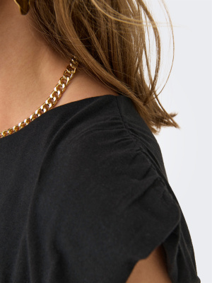 Ce top JDY revisite le minimalisme avec une coupe fluide et un col rond net. Les fronces délicates sur les épaules structurent la silhouette et apportent du relief, tandis que la base légèrement blousante crée un tombé souple et moderne.