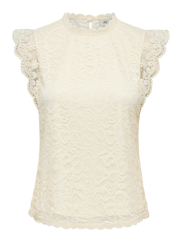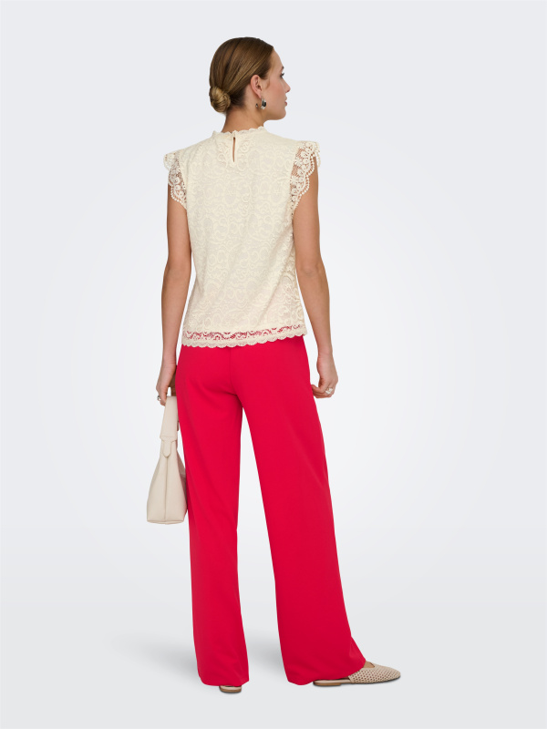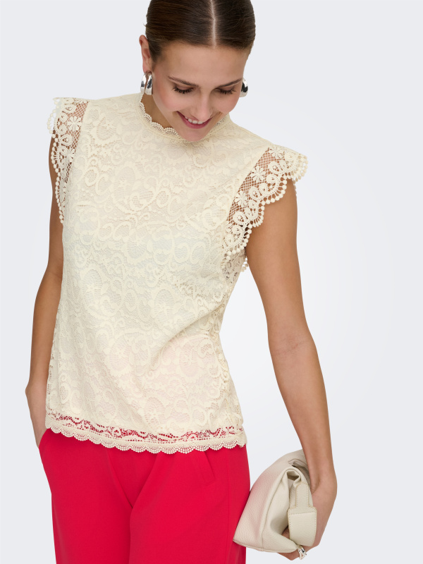 Son jeu de transparence, ses manches volantées et son col festonné signent une silhouette féminine et raffinée. La coupe fluide équilibre parfaitement le détail travaillé de la dentelle.