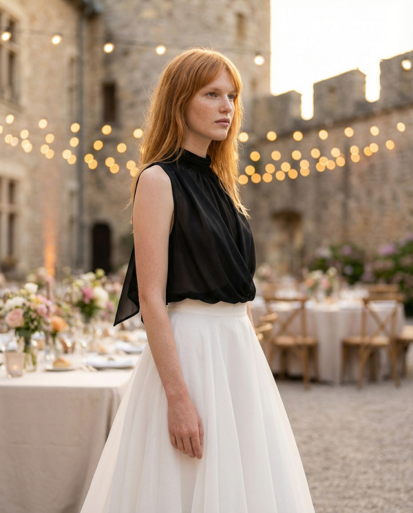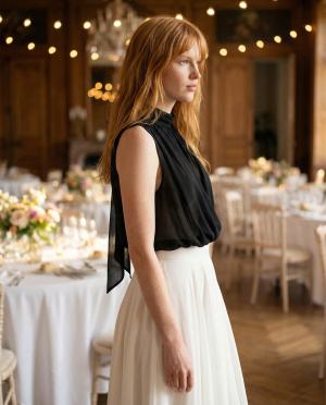 Top fluide en voile léger, décliné en noir et en blanc, pensé comme une pièce élégante et modulable. Sa matière aérienne crée un tombé souple et délicat, apportant mouvement et légèreté à la silhouette.