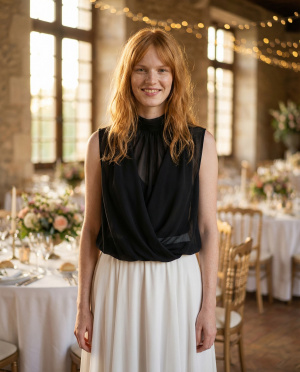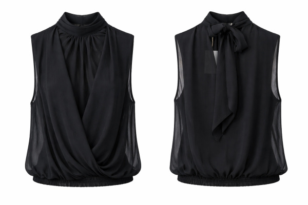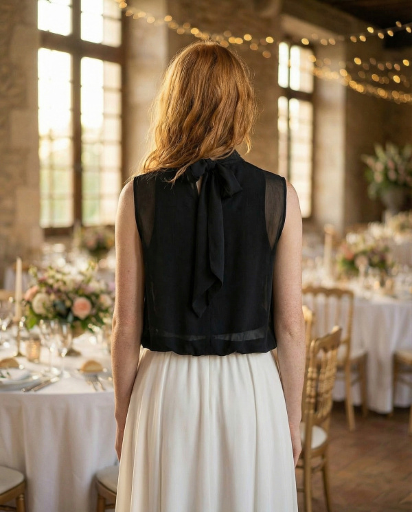 Le modèle se distingue par son col lavallière à nouer, qui permet de varier les styles : nœud structuré, lien lâché ou effet cravate. La coupe sans manches, légèrement ample, équilibre la transparence du tissu pour un rendu à la fois sophistiqué et moderne.
