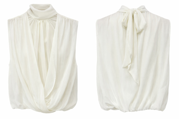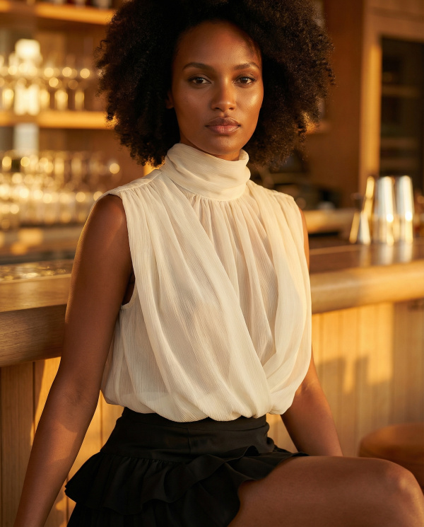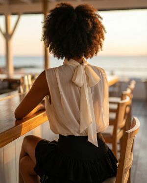 Le modèle se distingue par son col lavallière à nouer, qui permet de varier les styles : nœud structuré, lien lâché ou effet cravate. La coupe sans manches, légèrement ample, équilibre la transparence du tissu pour un rendu à la fois sophistiqué et moderne.