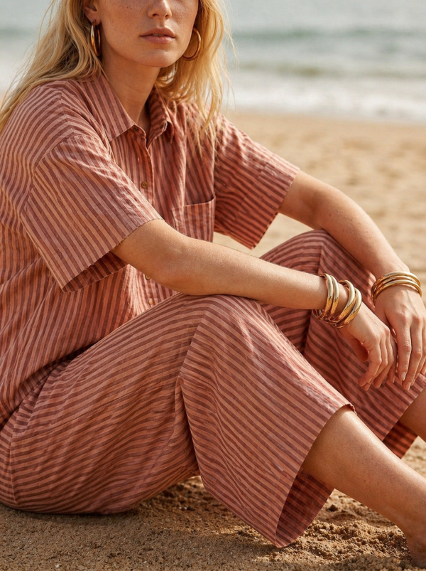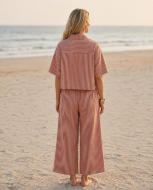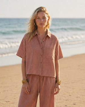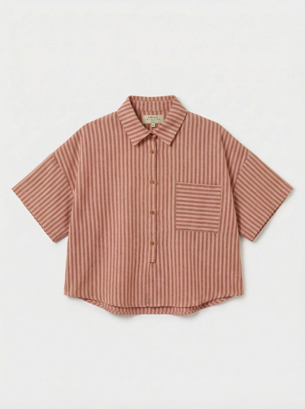 Sa coupe courte et légèrement oversize structure le look avec justesse, tout en apportant une touche contemporaine. Les manches courtes, volontairement larges, renforcent son allure décontractée, tandis que le col classique et la patte de boutonnage équilibrent la silhouette.