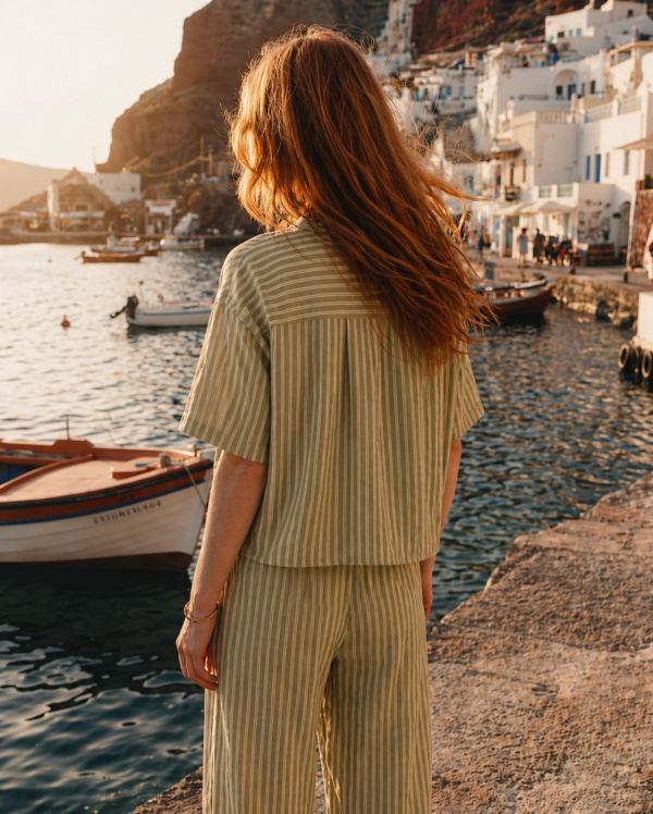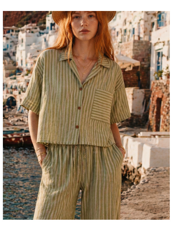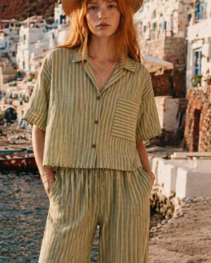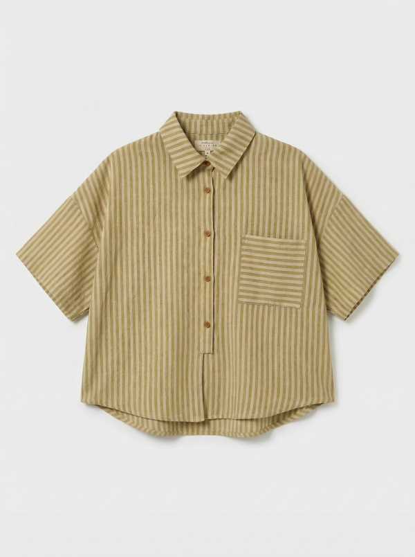 Sa coupe courte et légèrement oversize structure le look avec justesse, tout en apportant une touche contemporaine. Les manches courtes, volontairement larges, renforcent son allure décontractée, tandis que le col classique et la patte de boutonnage équilibrent la silhouette.